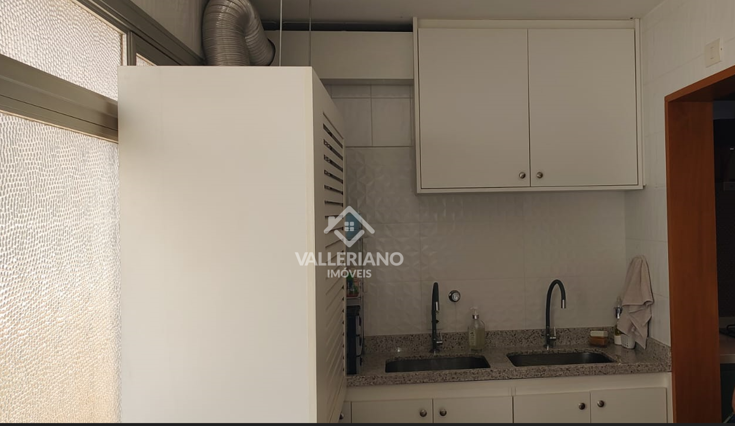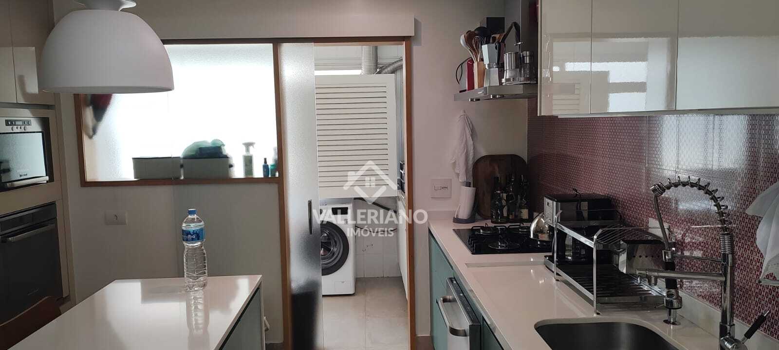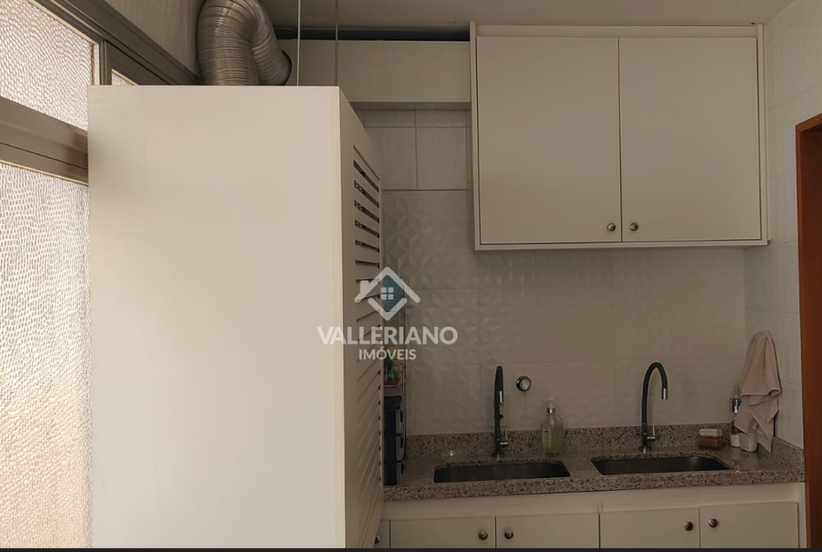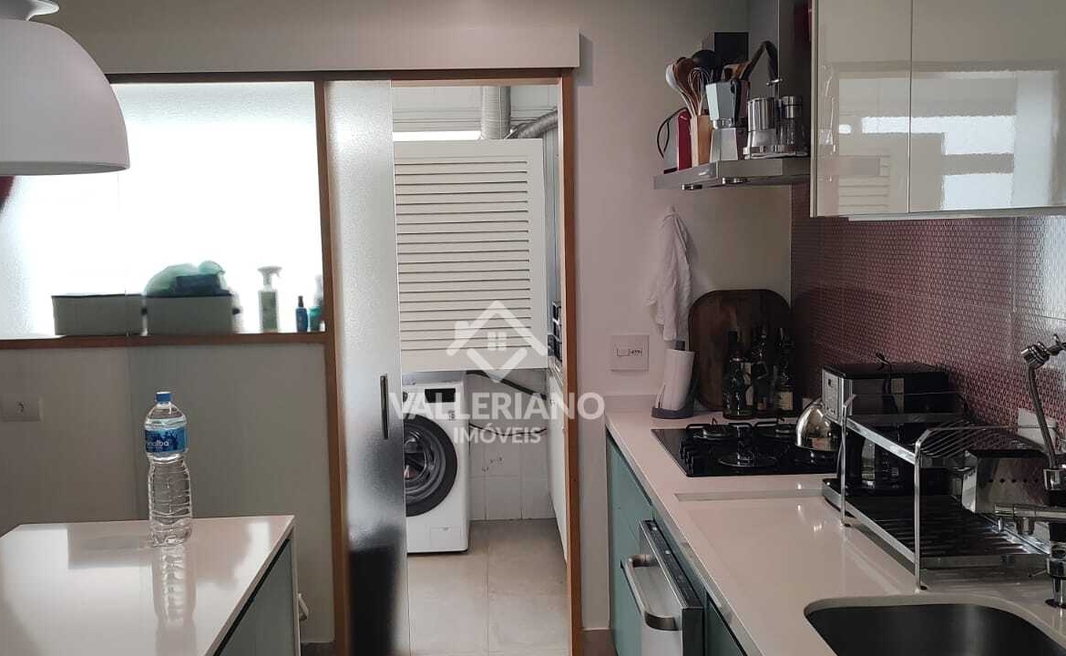 A cozinha possui armários sob medida, coifa instalada, forno e micro-ondas embutidos, além de boa ventilação e iluminação natural. A área de serviço é funcional e conta com armários e despensa.